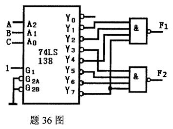 如题 36图所示, 74LS138是 3线-8线译码器。 要求:写出F1, F2的逻辑表达式,并判断该电路的逻辑功能。
