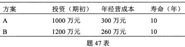 某项目有A和B两个备选方案,均能满足项目的需求,数据如题47表。请使用费用现值法比选最佳方案。