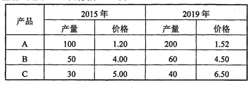 某经济体生产三种产品,它们在2015和2019年的产量和价格如下表所示,以2015年为基期,则其2019年的实际GDP为