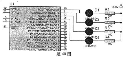 由LPC2138微控制器构成的电路如题40图所示。编写程序完成如下功能:发光二极管以跑马灯的形式交替闪烁,周期为0.ls,即D1且仅D1点亮0.1s,然后D2且仅D2点亮0.1s,依次类推。试完善下述程序,将程序中带有标号的空缺内容补充完整。