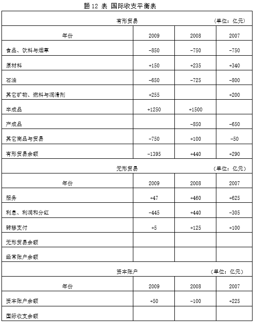 邻国新当选的政府面临严峻的财政危机,下面是最新发布的国际收支数据。表中的一些总计项缺失,但其余信息正确无误。 (1)根据有关信息,填充国际收支平衡表中的内容。(12分)(2)简述该国三年间经济变动情况