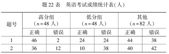 某年级178人参加英语考试,其中两道选择题的答题情况如题22表所示。请计算这两道题的难度和区分度。(计算结果保留两位小数)