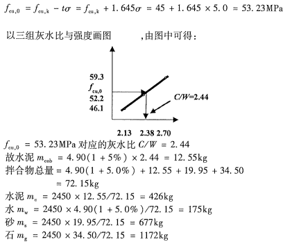 某混凝土工程,需要C45混凝土(σ=5.0MPa)。试配时按初步配合比试拌30L,各材料用量:水泥11.65kg、水4.90kg、砂19.95kg、石34.50kg,水灰比为0.42。试拌后,测得坍落度较设计值低35mm,黏聚性和保水性合格。在水泥和水增加5.0%后,测得坍落度符合要求,且黏聚性和保水性均合格,此时实测拌合物的体积密度为2450kg/m³。在此基础上,以水灰比0.37、0.42、0.47分别配制三组混凝土(水、砂、石用量与前述和易性合格后的混凝土相同),标准养护28d的抗压强度分别为59.3、52.2、46.1MPa。试计算实验室配合比。
