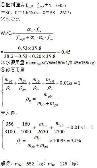 某工程C30的混凝土,现有水泥P·S 32.5,碎石和中砂,试用体积密度法计算混凝土初步配合比。(已知用水量160kg,水泥28d抗压强度35.8MPa,αa=0.53,αb=0.20,t=1.645,σ取5.0MPa,砂率取34%,砂石的表观密度分别为2.65、2.70g/cm3)