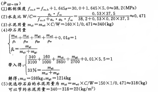 某工程需含气量为5.5%的C30混凝土,现有水泥P·S32.5,碎石和细砂,试用体积法计算混凝土初步配合比(此处仅计算砂石、水泥、水的用量)。(已知用水量160kg,水泥28d抗压强度37.5MPa,αa=0.53, αb=0.20,t=1.645,σ取5.0MPa,砂率取33%,水泥的密度为3.1g/cm3,砂石的表观密度分别为2.65、2.70g/cm3)若通过优选砂石骨料后,用水量可降至150kg/m3,问此时的配合比较原有配合比可节约水泥多少公斤(kg/m3)?(10分)