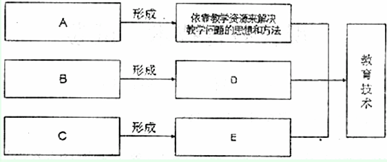 根据伊利(D.P.Ely)等专家在20世纪70年代初的研究,在答题卡上回答下图中未标明的A、B、C、D、E部分,说明美国教育技术的形成。