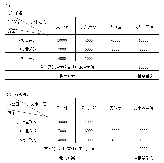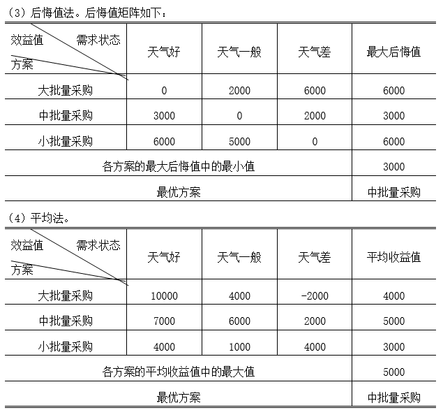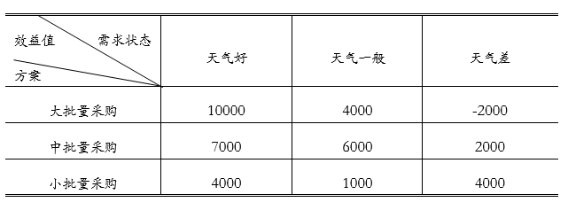 一些水果零售商准备在当地文化节时设水果零售亭。在文化节当天一大早,他们就去水果批发市场批发水果,他们必须决定是要买大批量、中批量还是小批量的季节性水果。他们的利润由销售毛收入减去购货成本及未售完水果的成本决定。这取决于参加文化节的人数,而参加人数又进一步取决于天气状况,不同天气状况条件下的利润矩阵如下表所示。