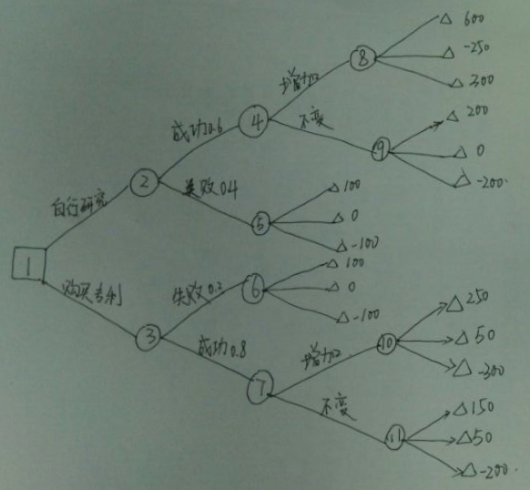 某工厂由于工艺水平问题产品成本较高:在产品价格中等时收益为0,价格低落时收益为-100万元,价格高涨时收益为100万元,该工厂拟改进该工艺,途径包括自行研究和购买专利,自行研究的成功可能性为0.6,购买专利的成功可能性为0.8。在改进工艺成功时,工厂可以选择产量增加或不变两种方案;若失败则保持原产量。当购买专利成功时,若增加产量,遇到价格中等时收益为50万元,价格低落时收益为-300万元,价格高涨时收益为250万元;若产量不变,遇到价格中等时收益为50万元,价格低落时收益为-200万元,价