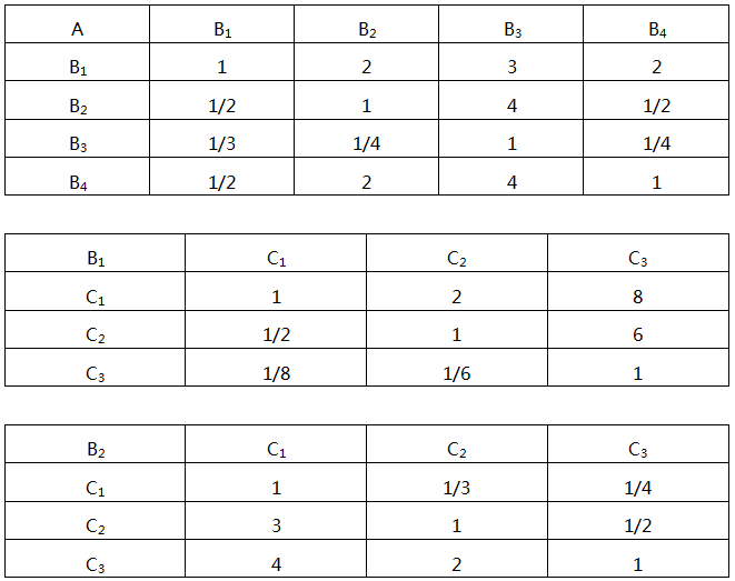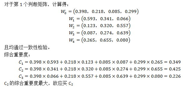 某顾客准备买房子,经初步调查确定了3套候选房子C1,C2,C3。在评判房子满意程度A时,该顾客确定了4个标准:B1:地理位置及交通;B2:居住环境;B3:房屋结构布局;B4:房屋单价。采用层次分析法进行评价,得到以下判断矩阵,请用和积法计算最优方案(已知当阶数为3时,RI=0.58,当阶数为4时RI=0.96)