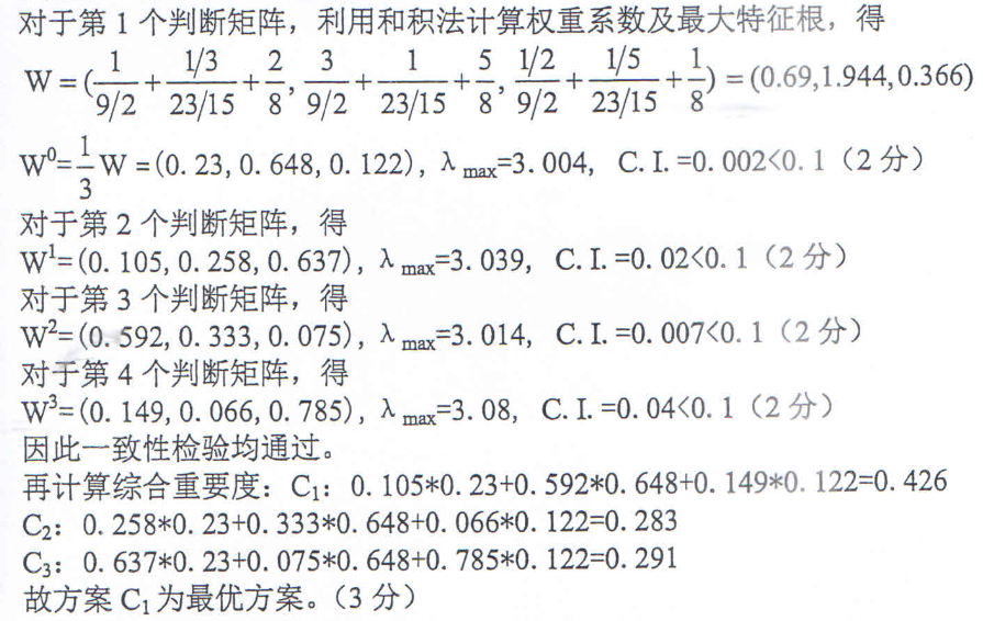 某企业拟进行投资,有三种方案可供选择:C1:兴建工厂、C2:购置资产、C3:存入银行。在评价投资效果A时,有3个标准:B1:风险、B2:收益、B3:流转。现拟采用层次分析法进行评价并请专家进行判断,得到以下判断矩阵,请计算最优方案。(已知当阶数为3时,R.I.=0.52)