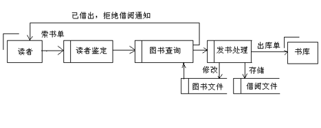 借书处理的过程是:接受读者提交的索书单,首先查看读者记录进行读者鉴别,再查询图书文件,进行存书查询;如果图书未借出,进行发书处理,存储借阅记录文件,并修改图书文件,再向书库发送出库单;如果图书已借出,向读者发送拒绝借阅通知。画出处理过程的数据流程图。