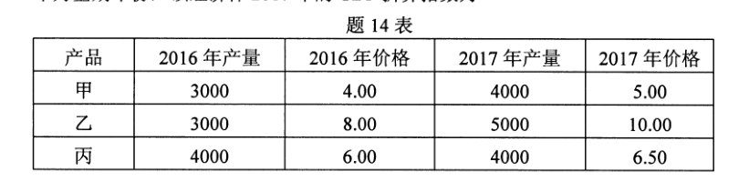 一个经济体生产三种产品,它们在2016和2017年的产量和价格如下表所示,以2016年为基期年份,该经济体2017年的GDP折算指数为