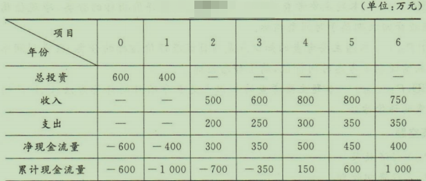 解:根据表格数据将表格补充完整,首先将各年现金流折算成净现金流,计算方法为“净现金流=收入-支出-总投资”,并计算各年累计净现金流量,如下表所示: