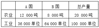 A和B是拥有同样数量经济资源的两个国家,他们都是能够生产农业和工业产品。下面的表格说明了如果两个国家分别用50%的资源生产每种产品的可能产量。如果两个国家都决定利用其全部资源生产各自拥有最大比较优势的产品,那么新的工业品总产量为