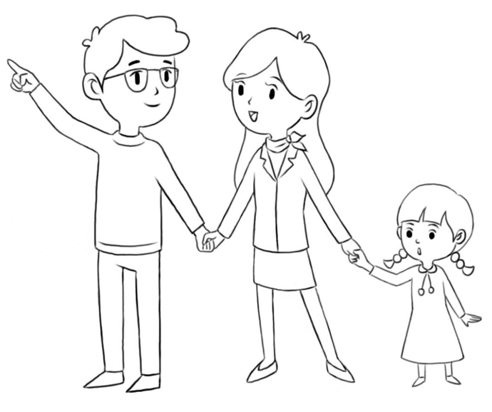 解析:三个角色符合一家人的感觉,可以不上色。2、年龄、性格、职业等特征表现明显,造型生动3、画面整洁,线条流畅