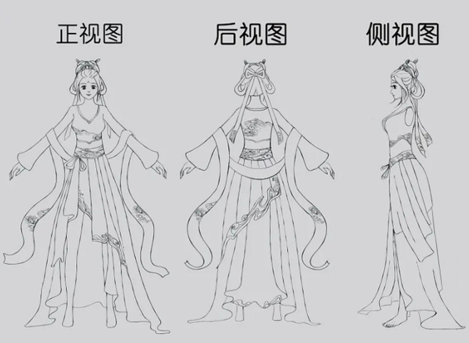 设计中国传统神话人物嫦娥的动漫形象,并绘画三个基本角度的转面图。