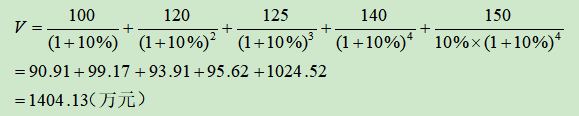 某房地产,经预测在未来4年的净收益将分别为100万元、120万元、125万元、140万元,从第5年以后到无限年,每年的净收益固定为150万元,资本化率为10%,无限年使用。求该房地产的收益价格。