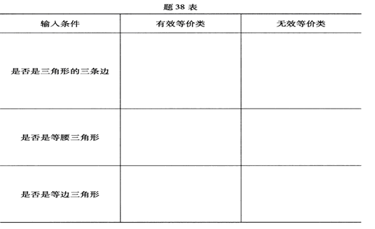 若有一个程序:输入3个整数ABC,把这3个数看作是一个三角形的3条边。这个程序要输出信息,来说明这个三角形的几种情况:是三边不等的、是等腰的、还是等边的。 请根据给出的说明,用等价类划分法完成题38表,并给每个等价类规定唯一的编号。 在“答题纸”上列表作答。