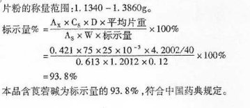 取华山参片40片(规格0.12mg/片),除去糖衣,精密称定得重量为4.2002g,研细,精密称出片粉1.2012g(约相当于莨菪碱1.44mg)置25ml量瓶中,加入枸橼酸一磷酸氢二钠缓冲溶液(pH4.0)稀释至刻度,摇匀5分钟,放置过夜,用干燥滤纸滤过,弃去初滤液,取续滤液得供试液。精密量取供试液与对照品溶液(每1ml相当于含莨菪碱75μg)各2ml,分别置分液漏斗中,各精密加入枸橼酸一磷酸氢二钠缓冲溶液(pH4.0)10ml,再精密加入由上述缓冲液配制的0.04%的溴甲酚绿2ml,摇匀,用10ml氯仿振摇提取5分钟,分取氯仿层,滤入25ml量瓶中,稀释至刻度,照分光光度法在415mm下测吸光度,测得供试品溶液与对照品溶液的吸光度分别为0.613和0.421,本品含生物碱以莨菪碱 (C17H25N03)计,应为标示量的80%-120%。试计算片粉的称量范围,并计算本品是否符合中国药典的规定。