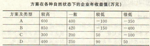 某企业拟上市一种新产品,由于缺乏资料,企业对这种产品的市场需求量只能大致估计为四种情况:较高、一般、较低和很低。对这四种自然状态下发生的概率无法预测。上此新产品企业考虑有四种可行方案:较高价格出售(A)、中等价格出售(B)、较低价格出售(C)、很低价格出售(D)。各方案的损益情况如下表。试运用不同的决策标准进行决策,选取最优的可行方案(假设a=0.7)。