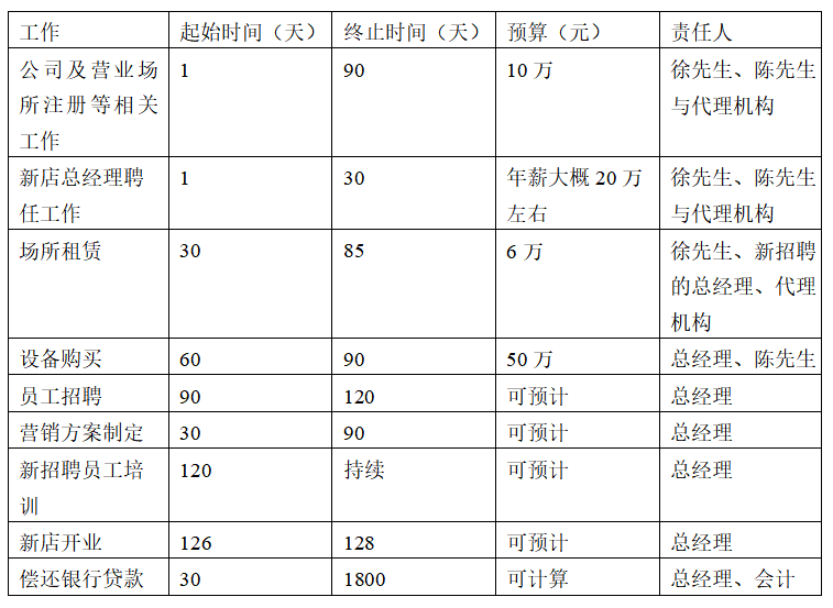 新店筹备与开业工作可以分解为公司及营业场所注册、总经理和员工招聘、设备的购买等,并依据这些工作之间的关系加以监督和管理。