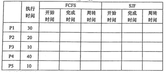 有5个进程P1、P2、P3、P4和P5,它们在0时刻同时依次进入就绪队列,其执行时间如题36表所示:题36表 (1)请在表中给出先来先服务算法(FCFS)和最短进程优先算法(SJF)下各进程的开始时间(即开始运行时间)、完成时间和周转时间。(2)计算在上述两种