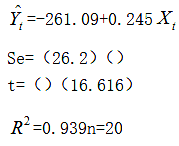 以1991~2010年中国某地区进口总额Y(亿元)为被解释变量,以地区生产总值X(亿元)为解释变量进行回归,得到回归结果如下:要求:(1)将括号内缺失的数据补充