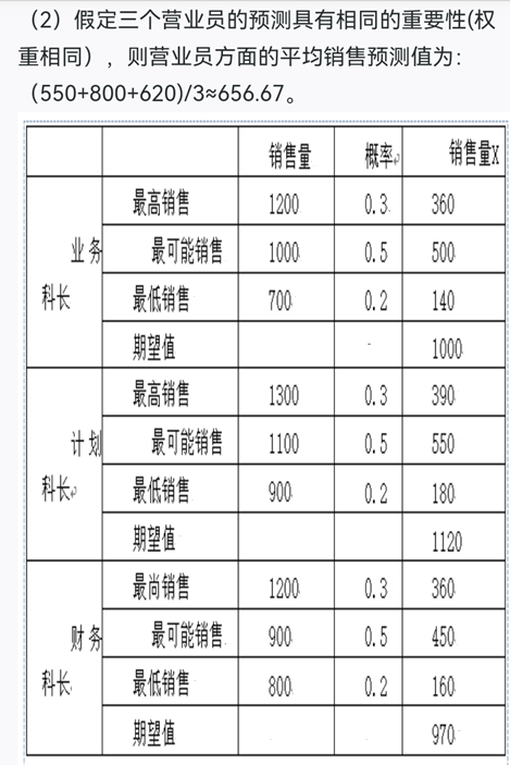 (3)经理方面的销售预测,按照以上同样方法判断,甲、乙、丙三位经理的判断期望值分别为:1200,1100,950。
