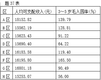 下一篇:题37表数据为某市8个区2017年人均可支配收入与3~5岁幼儿毛入园率统计结果。试以该表数据为例,说明可用何种预测方法分析幼儿毛入园率与人均可支配收入的关系。(要求指出具体的统计方法及主要操作要点,不需要做具体计算)