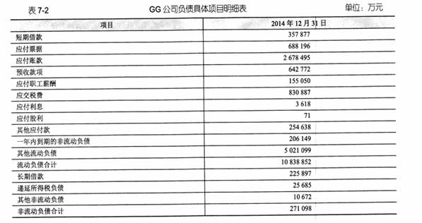根据该公司当年资产负债表了解到该公司的期末流动负债、长期负债分别为10,838,852万元和271,098万元。具体项目构成如表7-2所示。