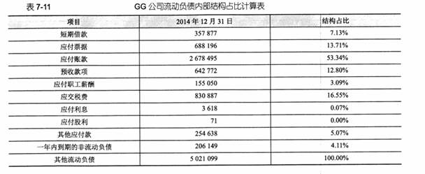 现金净流量全部债务比率=1 421271÷(10838852+271098)=0.1279(2)流动负债在全部负债中的比例=10838852÷(10 838 852+271098)=97.55%表7-11所示为GG公司流动负债内部结构占比计算表。