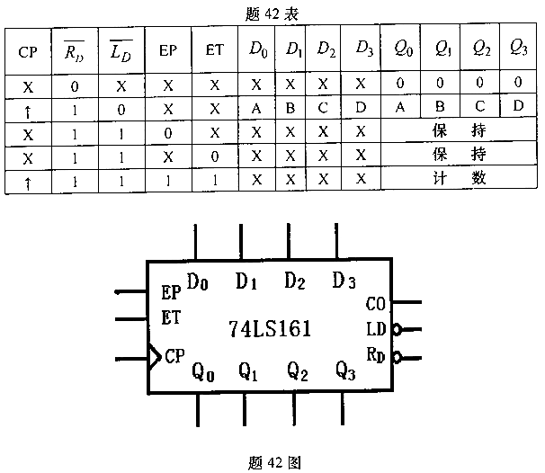 题42表为74LS161真值表,试用74LS161设计一个异步置零的8进制计数器。要求:(1)写出Sˇ8的二进制代码;(2)写出反馈置零的函数表达式;(3)在答题纸上完成题42图的逻辑图连线,并在各输入输出端标上连接信号。
