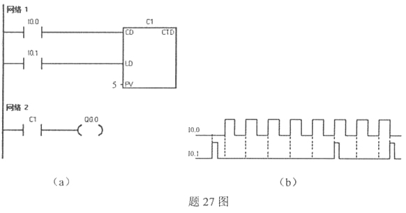 题27图(a)为一个计数程序,图(b)为时序图,10.0输入的是8个脉冲信号, 回答以下问题: (1) C1是哪种计数器? (2) 对C1而言,I0.0、I0.1各输入的是什么信号? (3)