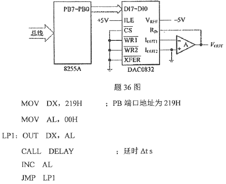 如题36图所示,利用8255A作为8088与DAC0832之间的接口,8255A的工作方式己设定为B 口输出,DAC0832工作于直通方式。阅读下列程序段,画出Vout端输出波形图。