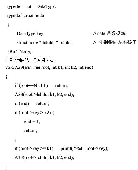 二叉树的存储结构类型定义如下: (1)设二叉排序树T如题33图所示,bt是指向根结点的指针。给出执行A33(bt,6,100,0)的输出结果。
