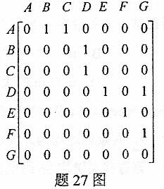 已知图G采用邻接矩阵存储,邻接矩阵如题27图所示。 (1)根据邻接矩阵画出图G。 (2)根据图G写出从顶点A开始图G的1个深度优先搜索遍历序列。 (3)根据图G写出从顶点A开始图G的1个广度
