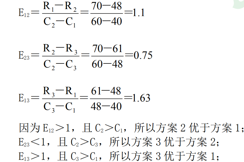三个方案的绝对经济效益均大于 1,其中方案 3 的绝对经济效益最大,但是否是最佳方案还要进行相对经济效益分析。 三个方案的相对经济效益如下: