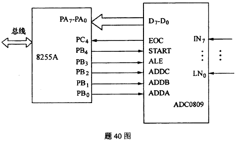 ADC0809通过并行接口8255A与PC连接,如题40图所示,补充完整以下程序段,实现对通道3的数据采集。设8255A的端口地址范围800H~803H,PA口地址为800H。