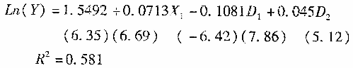 劳动经济学家提出假设,个人信用不良记录会使收入下降。据650位就业者的数据,得到如下回归模型:其中,Y=收入,X(下标1)=受教育年限,D(下标1)=1有不良信