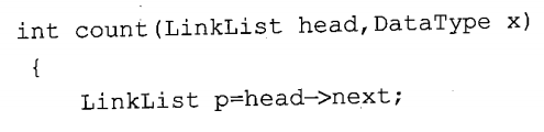 试编写一个函数int count(LinkList head, DataType x)统计单链表中数据域为x的结点个数。