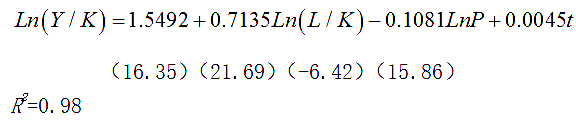 经济学家提出假设,能源价格上升导致资本产出率下降。据30年的季度数据,得到如下回归模型:其中,Y=产出,K=资本流量,L=劳动投入,P(下标t)=能源价格,t=时间。括