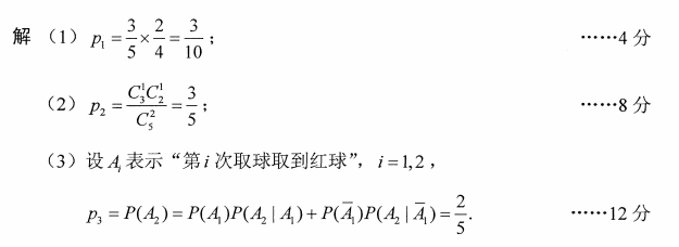 设袋中有3个白球,2个红球,连续 不 放回地从袋中取两次球,每次取一个. 求:(1)第一次取到白球,第二次取到红球的概率p1;(2)两次取到不同颜色球的概率p2;(3)第二次取球取到红球的概率p3.