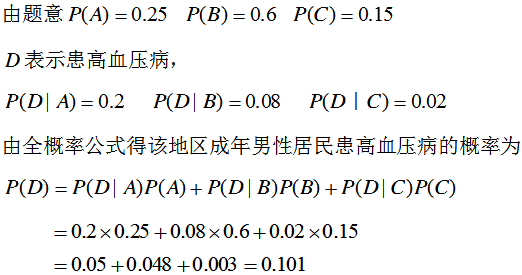 设某地区地区男性居民中肥胖者占25%,中等者占60%,瘦者占15%,又知肥胖者患高血压病的概率为20%,中等者患高血压病的概率为8%,瘦者患高血压病的概率为2%,试求:该地区成年男性居民患高血压病的概率