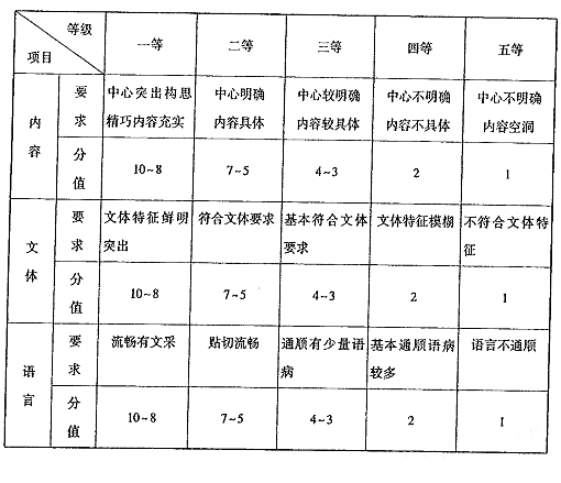 (3)内容得分为四等的文章,其语言、文体均不能给一等的分数;内容得分为五等的文章,其语言、文体均不能给二等以上的分数。