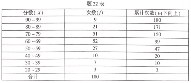 180名考生语文成绩的累计次数分布,如题22表所示。其中,A考生的成绩为85分。请计算A考生的百分等级。