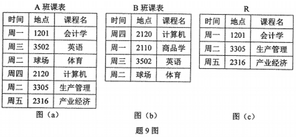 已知关系“A班课表”和“B班课表”如题9图(a)、(b)所示,两个关系经过关系运算得到的结果R如题9图(c)所示,所采用的关系运算是