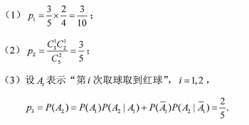 设袋中有3个白球,2个红球,连续不放回地从袋中取两次球,每次取一个.求:(1)第一次取到白球,第二次取到红球的概率p1;(2)两次取到不同颜色球的概率p2;(3)第二次取球取到红球的概率p3.
