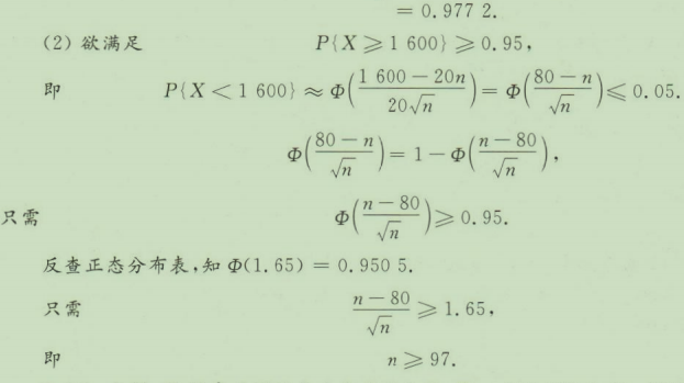 设某种器件使用寿命(单位:小时)服从指数分布,平均使用寿命为20小时,具体使用时,当一个器件损坏后立即更换一个新器件,如此继续,假定一年内需用1600个工作小时。(1)求100个这样的器件够用一年的概率;(2)要以95%的把握够用一年,至少需要多少个这种器件?