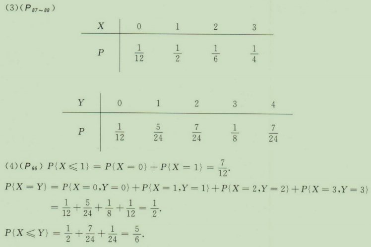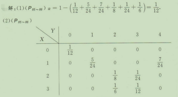 如果(X,Y)的所有可能取值为(0,0),(1,1),(1,4).(2,2),(2,3),(3,2).(3,3),而且取这些值的相应概率为1/12,5/24,7/24,1/8,1/24,1/6,α。求:(1)α的值;(2)(X,Y)的分布律;(3)(X,Y)的边缘分布律;(4)P{X≤1},P{X=Y},P(X≤Y}。