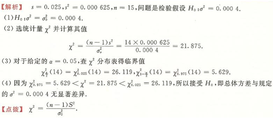 从一批轴料中取15件测量其椭圆度,计算得s=0.025,问该批轴料椭圆度的总体方差与规定的σ2=0.0004有无显著差别?(ɑ=0.05,椭圆度服从正态分布.)